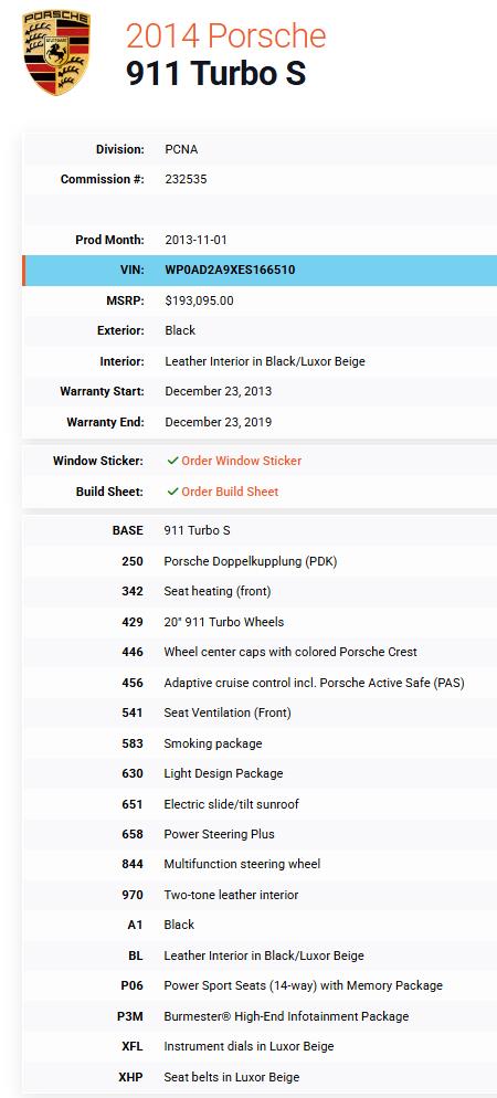 Porsche Doppelkupplung (PDK), Seat heating (front), 20'' 911 Turbo Wheels, Wheel center caps with colored Porsche Crest, Adaptive cruise control incl Porsche Active Safe (PAS), Seat Ventilation (Front), Smoking package, Light Design Package, Electric slide/tilt sunroof, Power Steering Plus, Multifunction steering wheel, Two-tone leather interior, Black, Leather Interior in Black/Luxor Beige, Power Sport Seats (14-way) with Memory Package, Burmester High-End Infotainment Package, Instrument dials in Luxor Beige, Seat belts in Luxor Beige