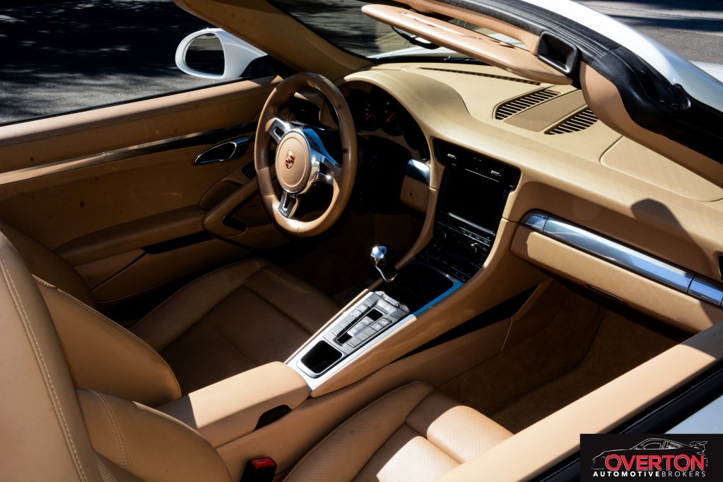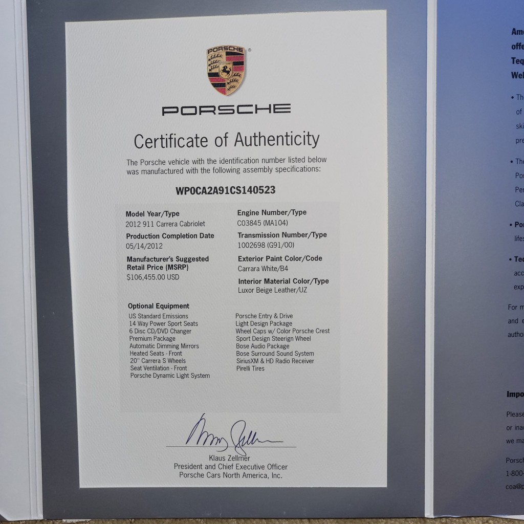 The new 911 Carrera Cabriolet, Automatically dimming mirrors, Seat heating (front), 20-inch Carrera S wheel, Wheel center caps with colored Porsche Crest, 7-speed Manual Transmission, Seat Ventilation (Front), Porsche Dynamic Light System, Porsche Entry & Drive, Light Design Package, Navigation Module, SportDesign steering wheel, Carrara White, Power Sport Seats (14-way), BOSE Audio Package, Luxor Beige leather interior. Certificate of Authenticty included. Blackstone oil analysis available as well.