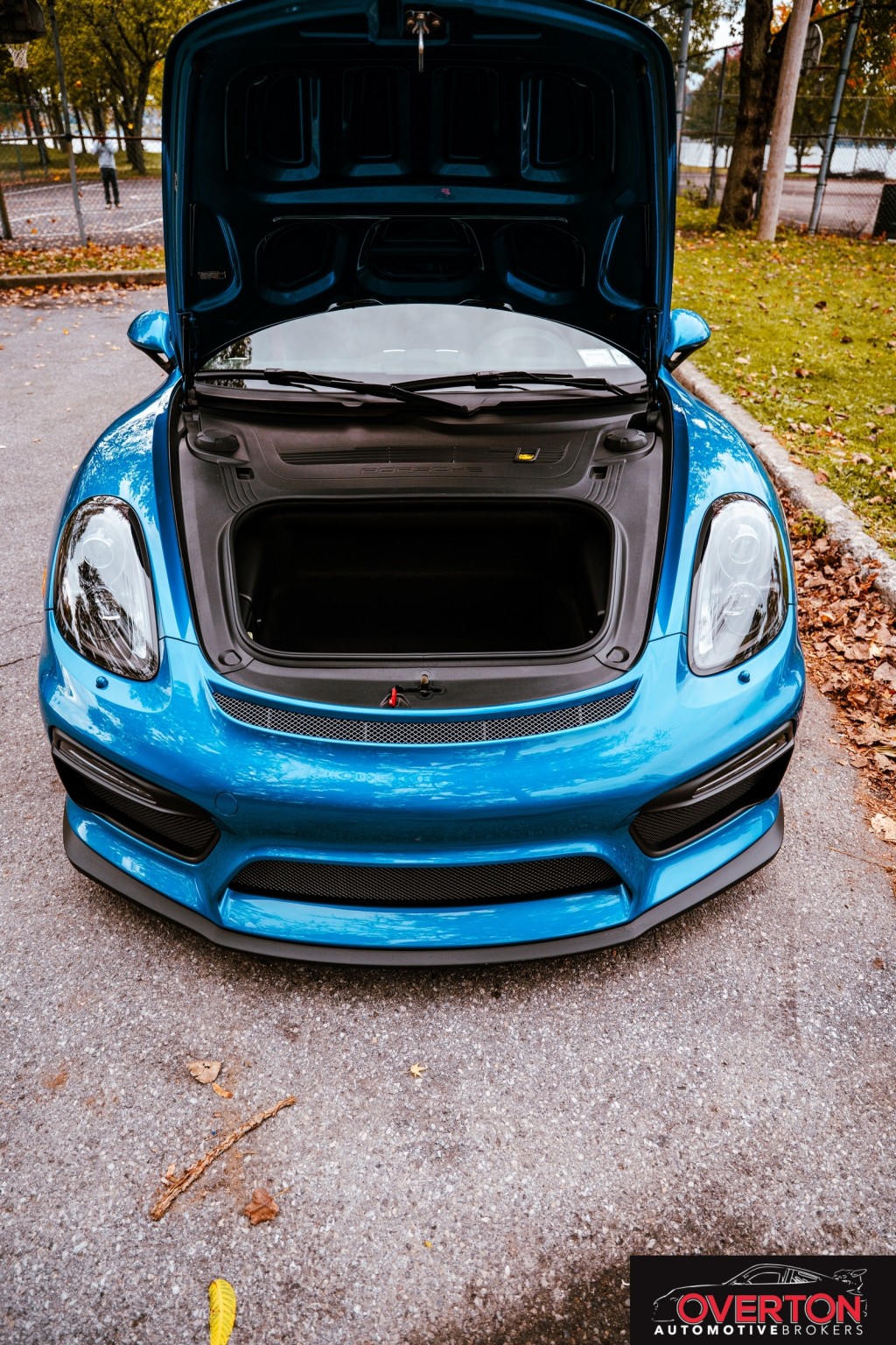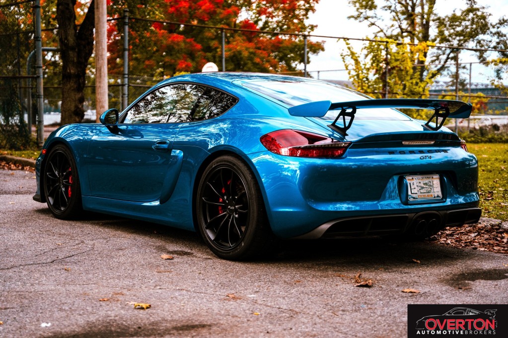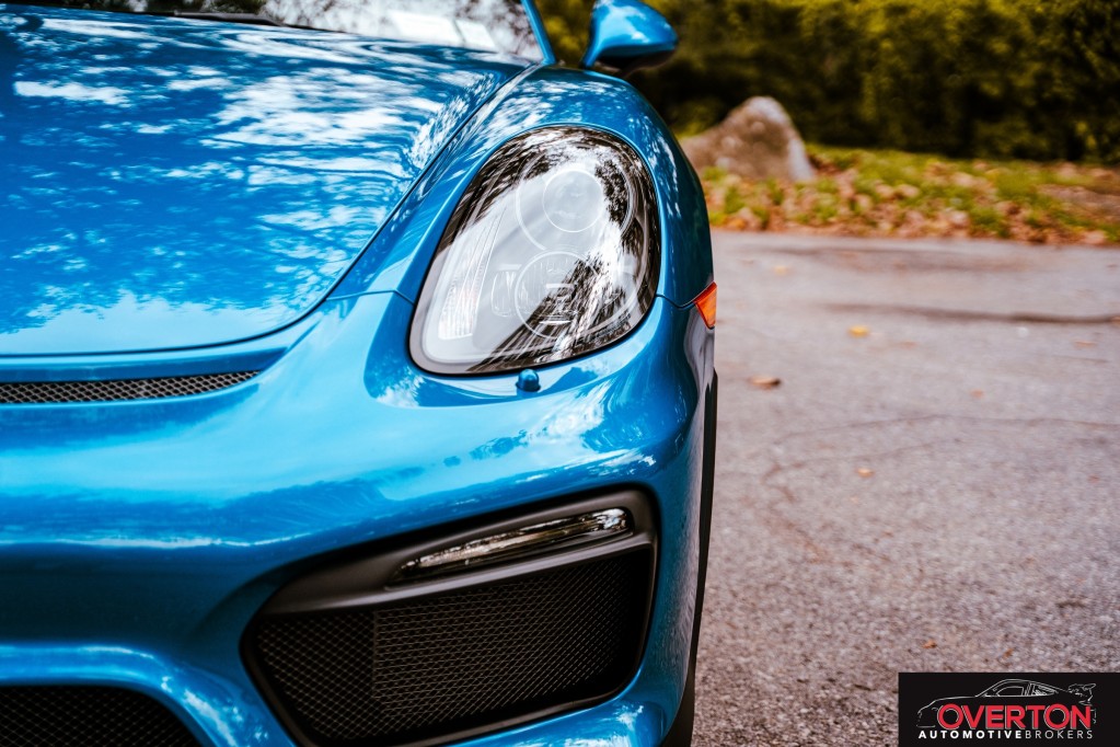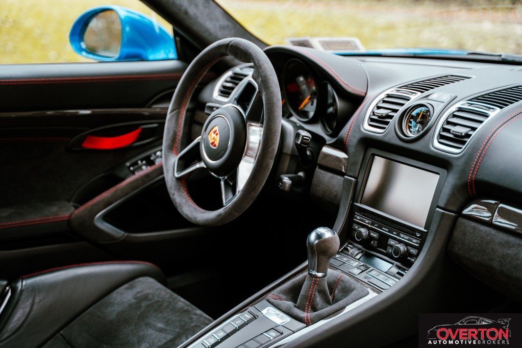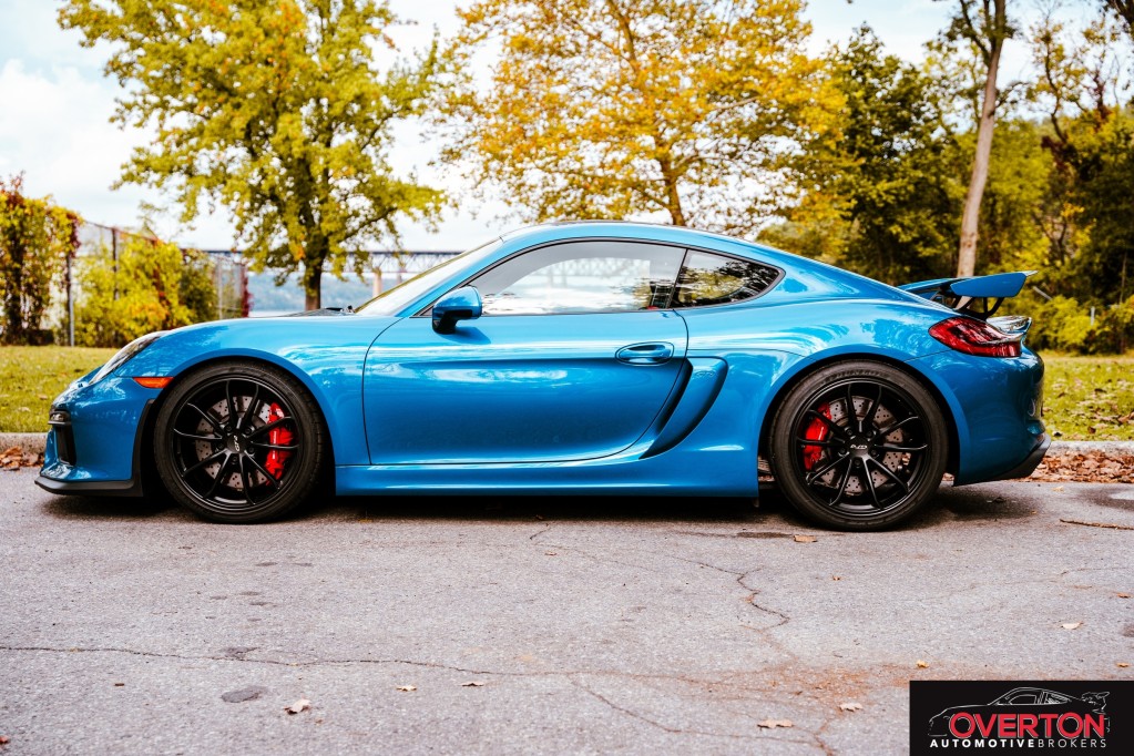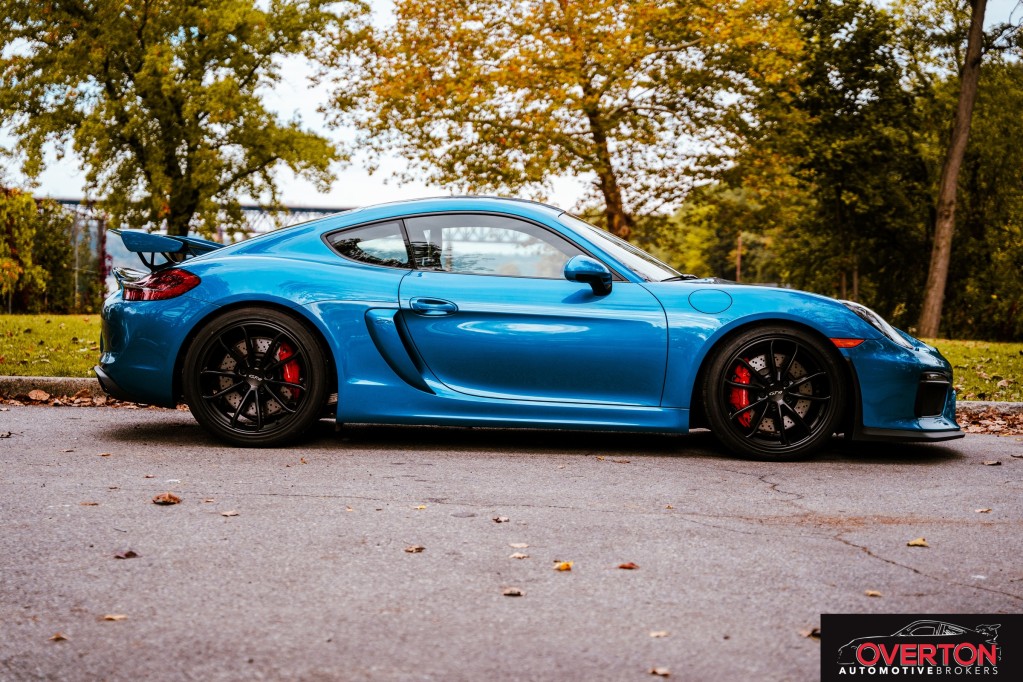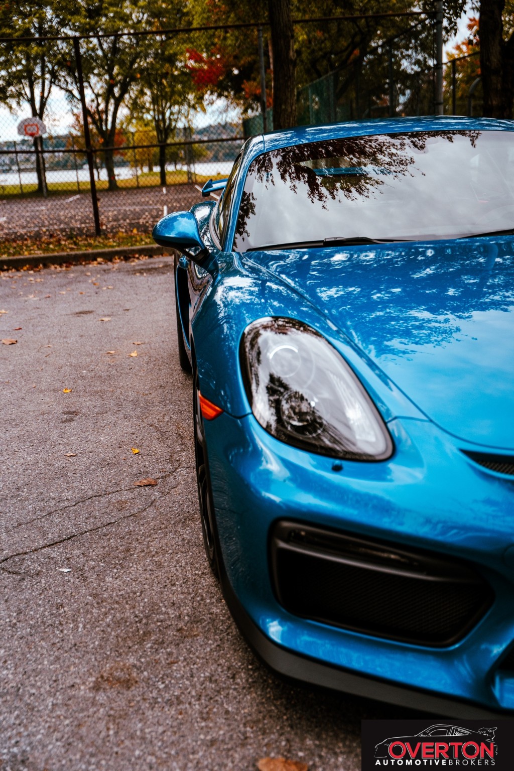 2016 Porsche Cayman GT4 in Sapphire Blue Metallic with Black Leather Interior and Guards Red Stitching.