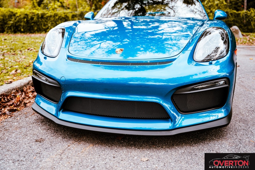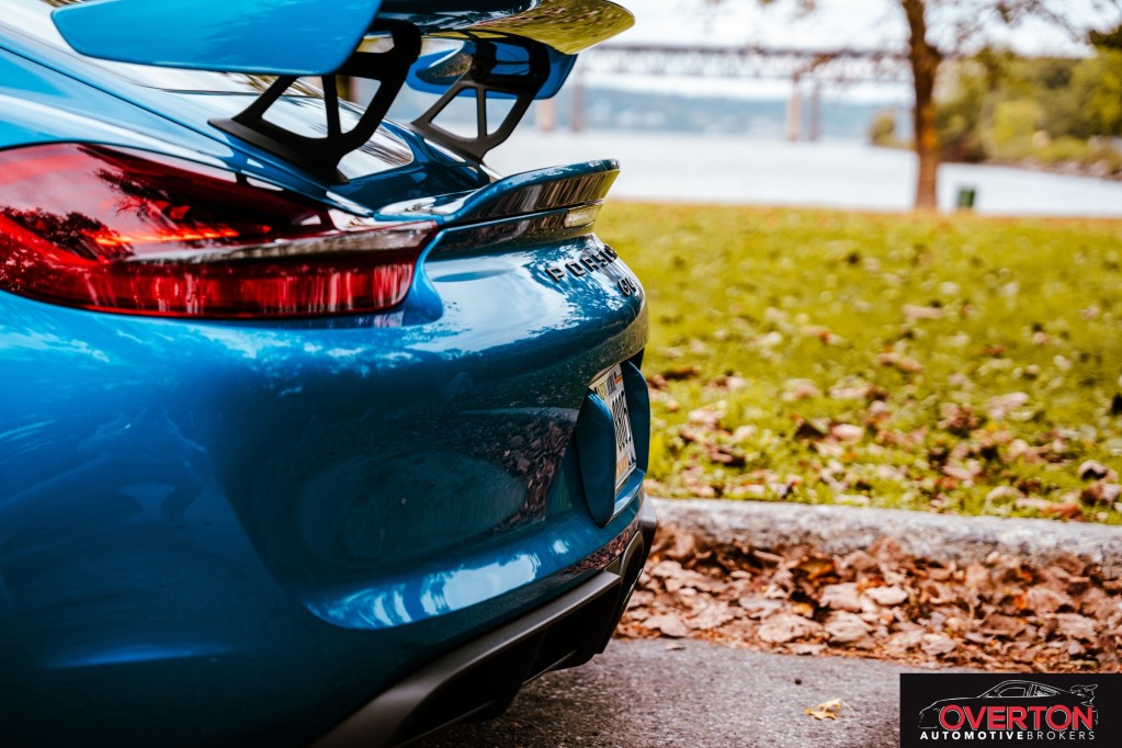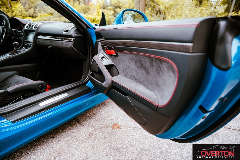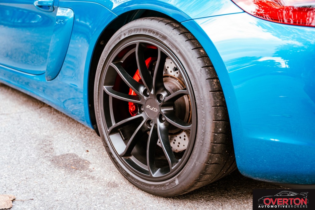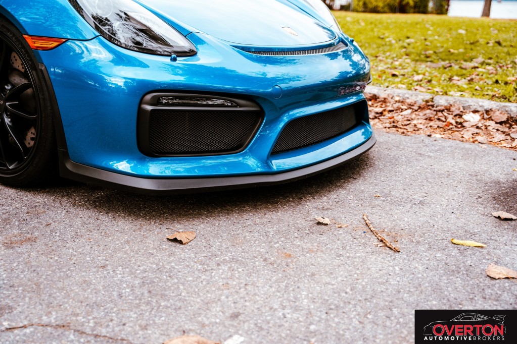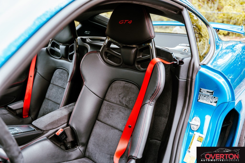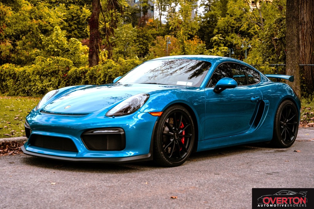 2016 Porsche Cayman GT4 in Sapphire Blue Metallic with Black Leather Interior and Guards Red Stitching.