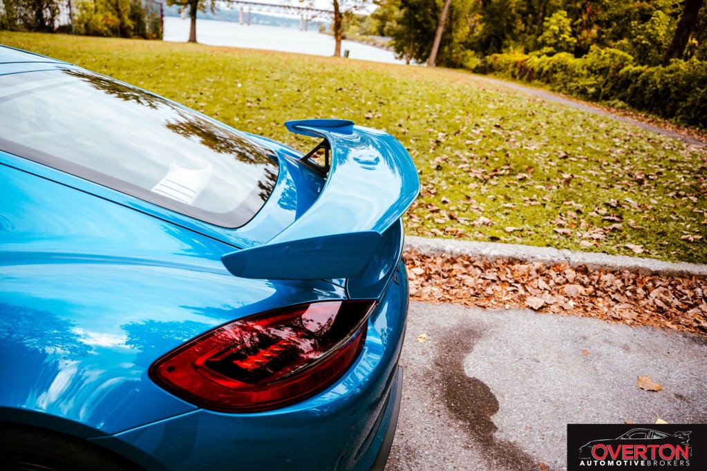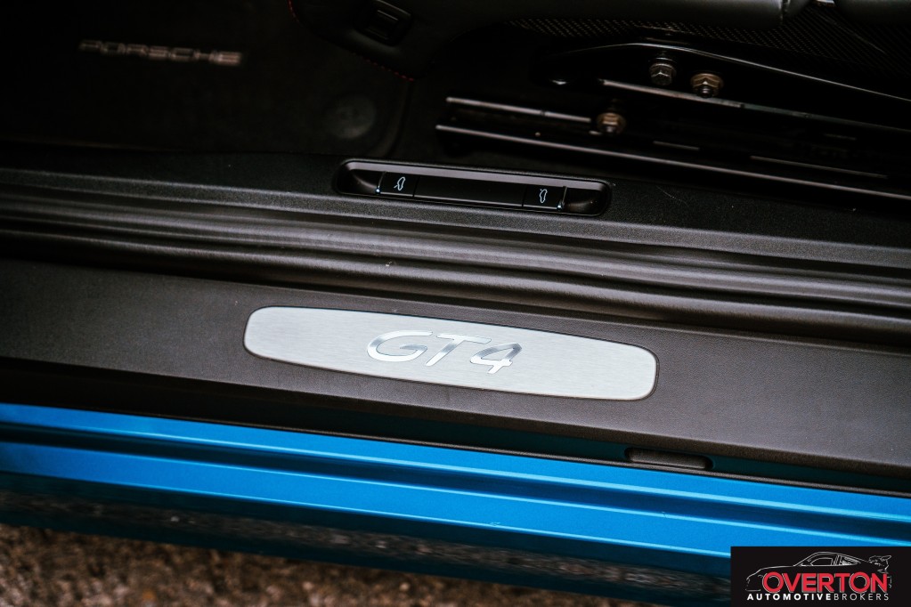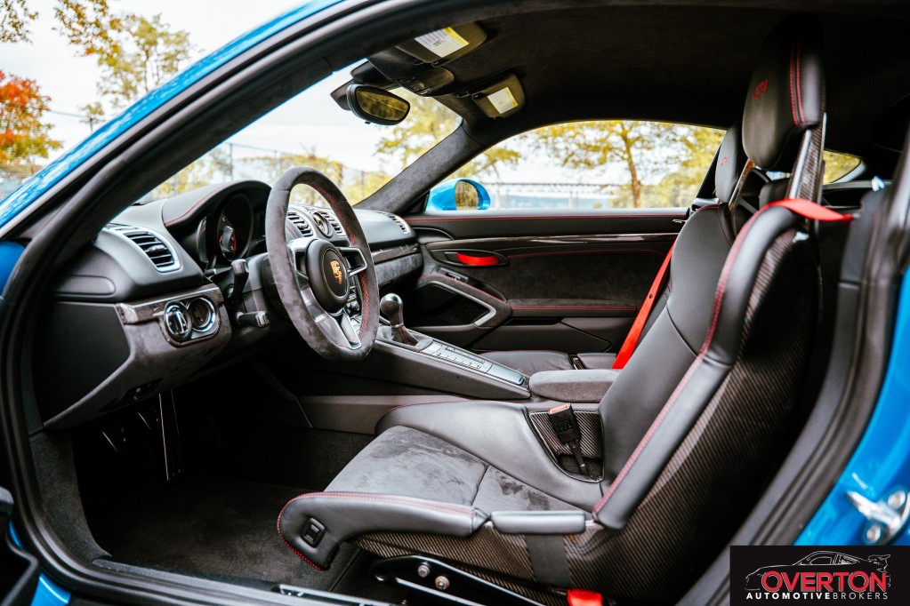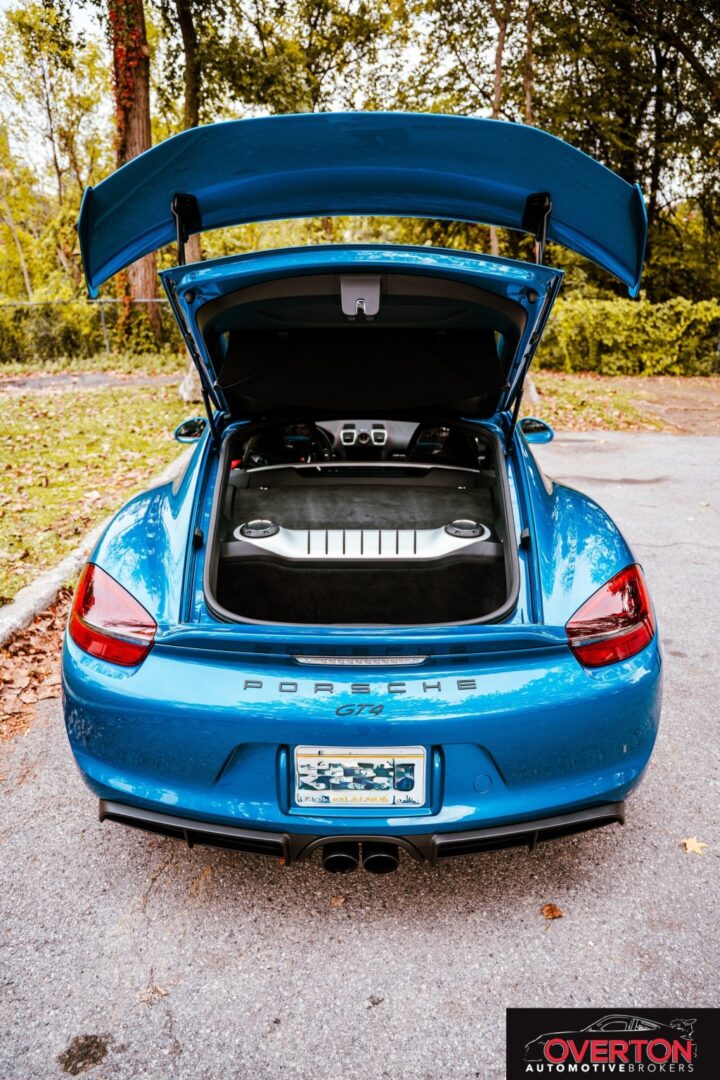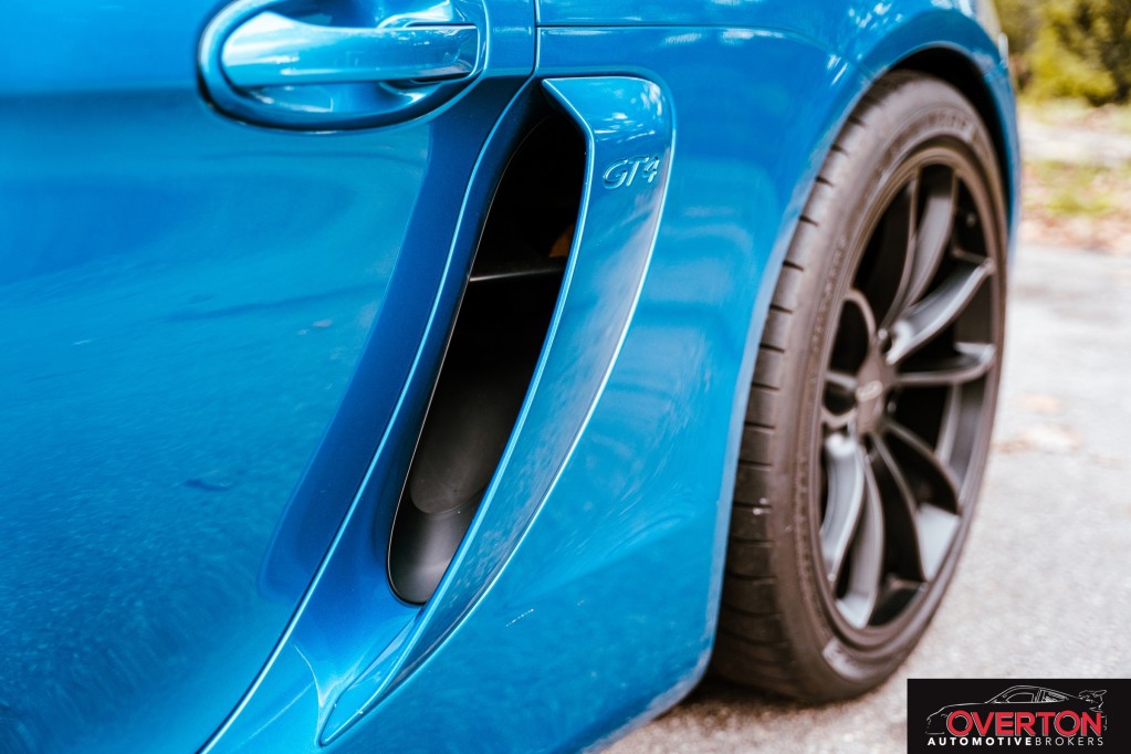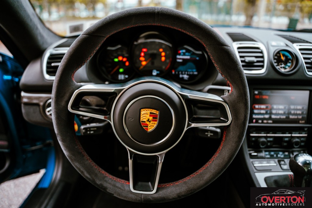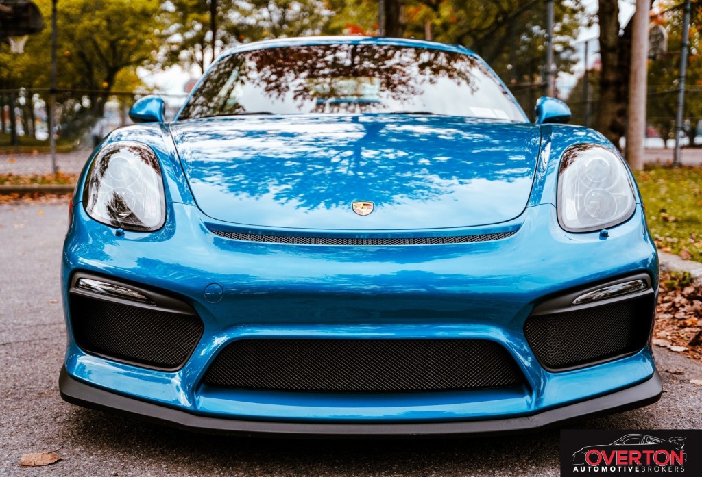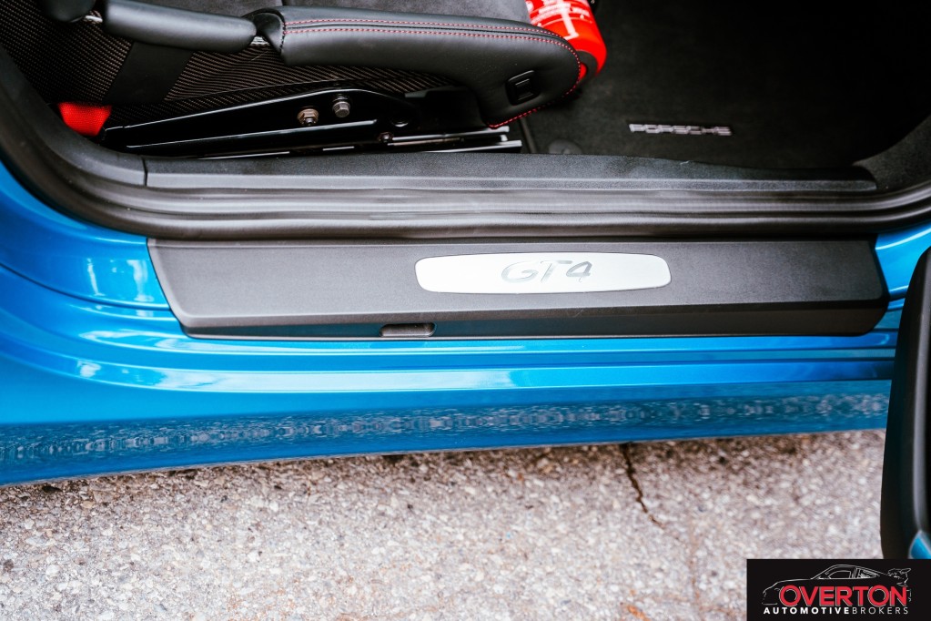 2016 Porsche Cayman GT4 in Sapphire Blue Metallic with Black Leather Interior and Guards Red Stitching.