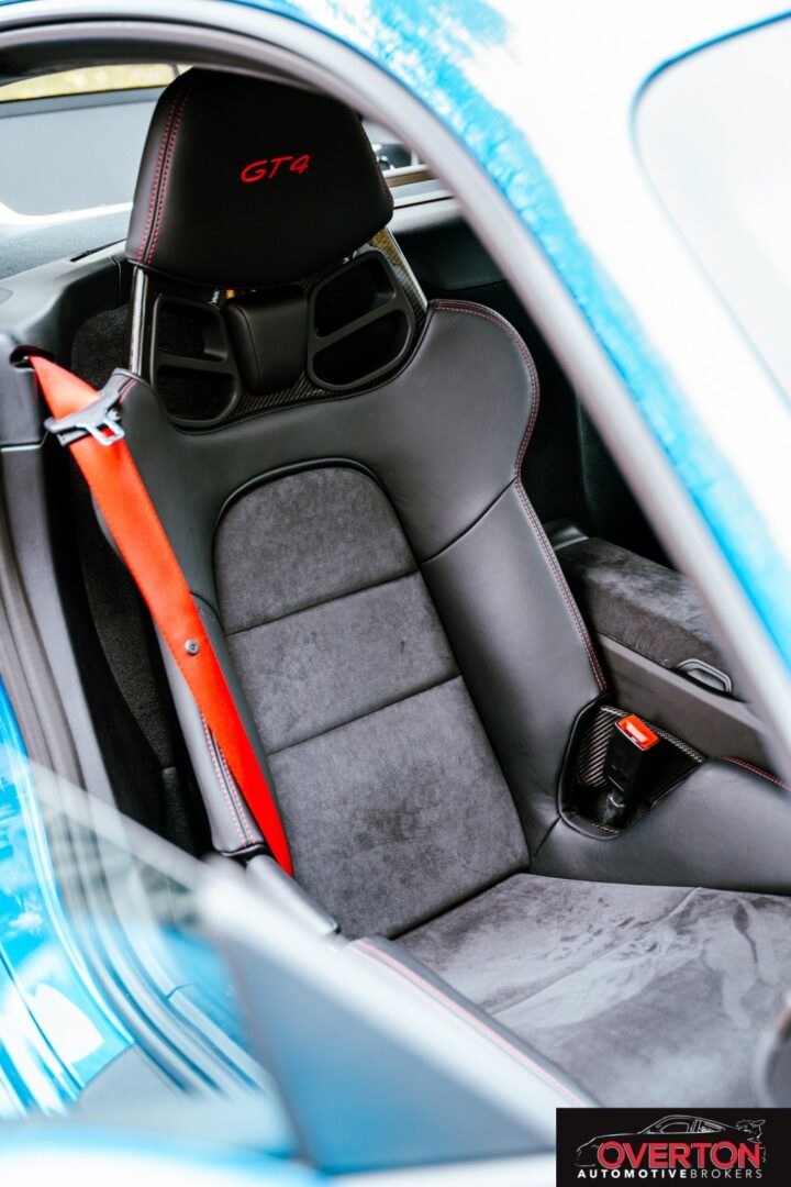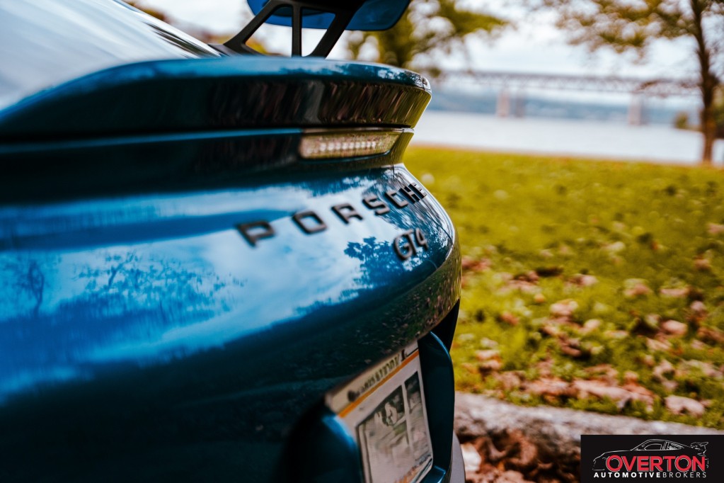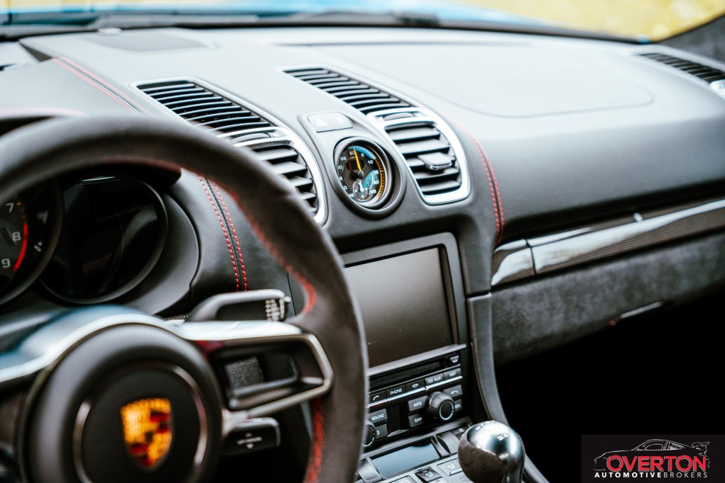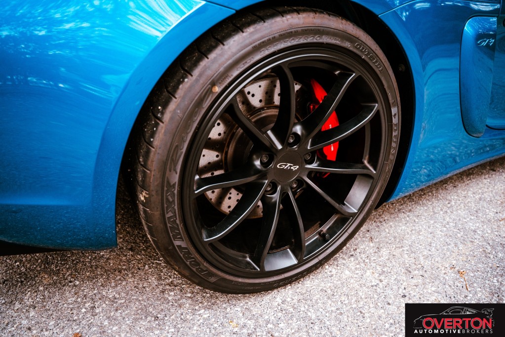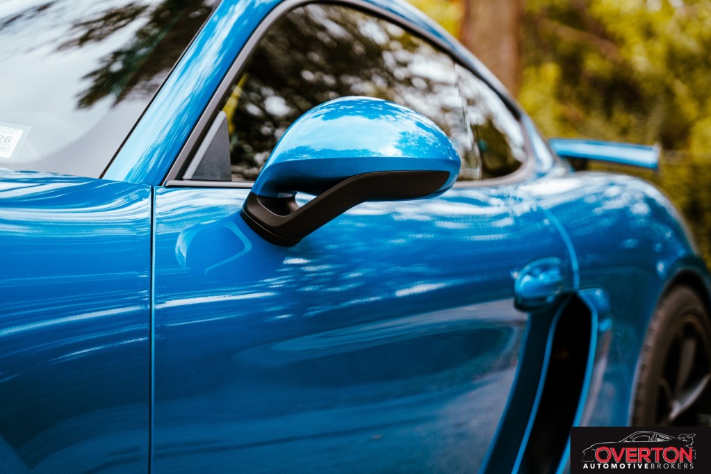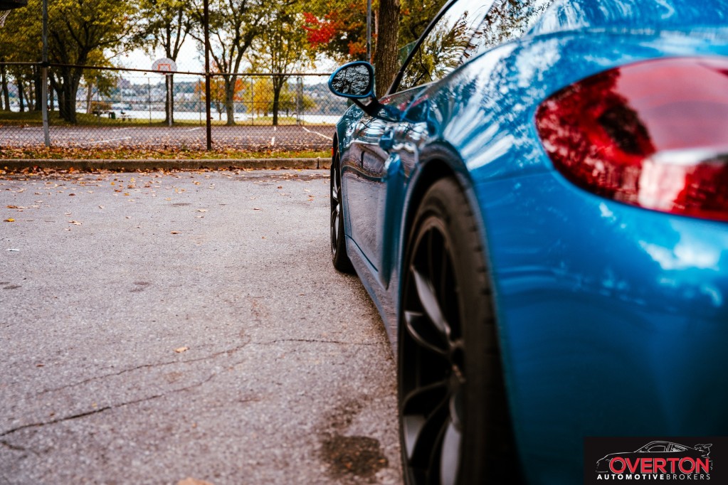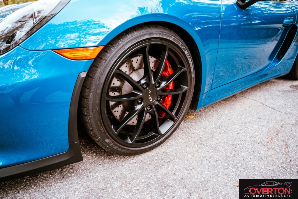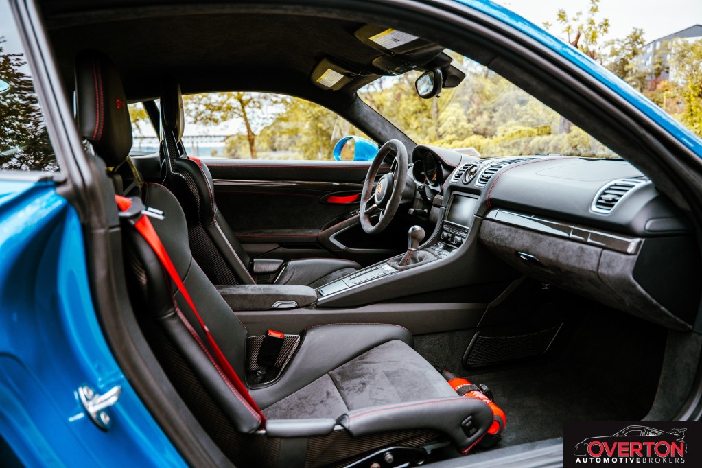 2016 Porsche Cayman GT4 in Sapphire Blue Metallic with Black Leather Interior and Guards Red Stitching.