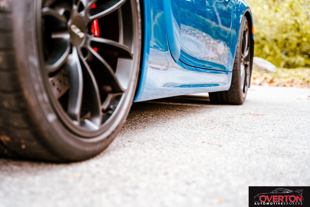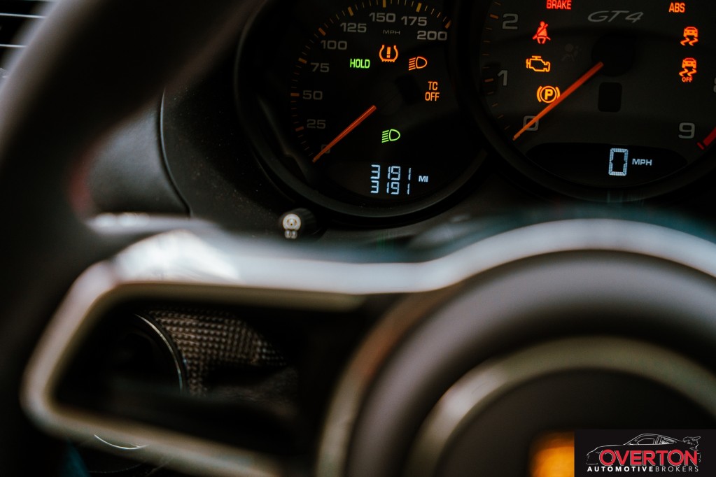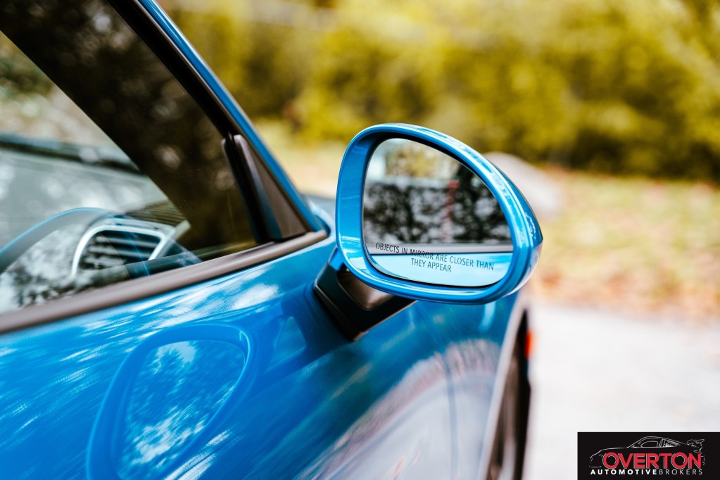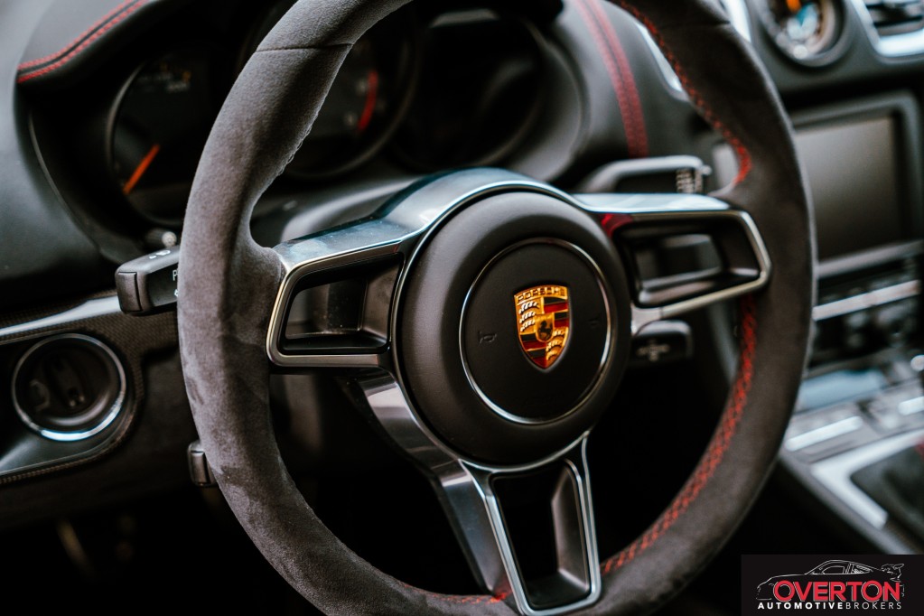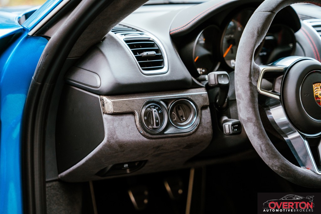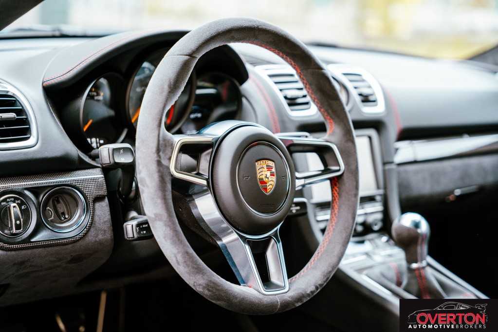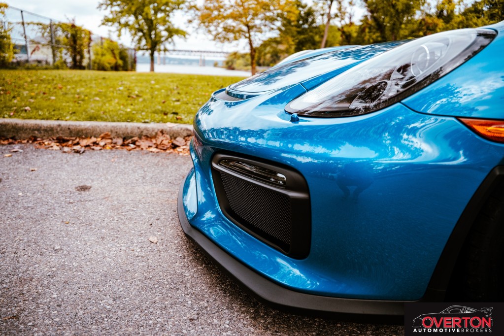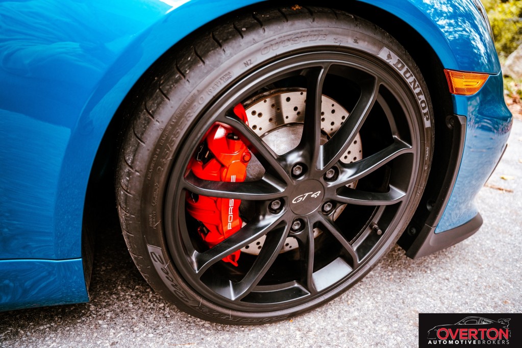 2016 Porsche Cayman GT4 in Sapphire Blue Metallic with Black Leather Interior and Guards Red Stitching.