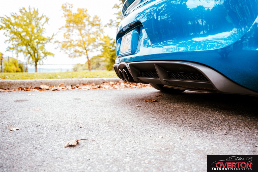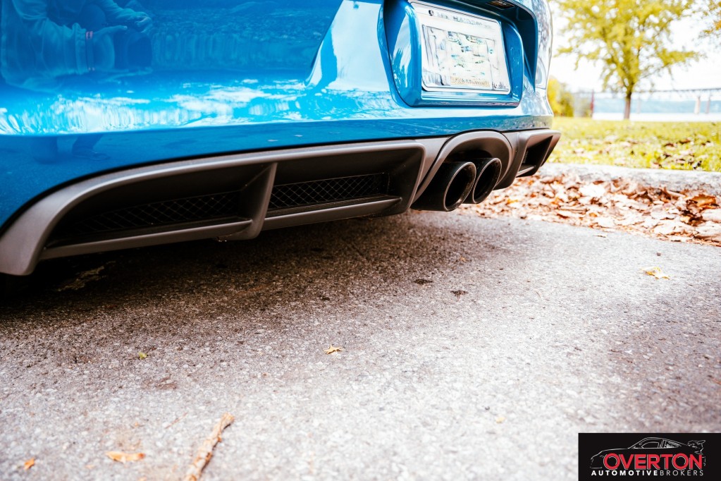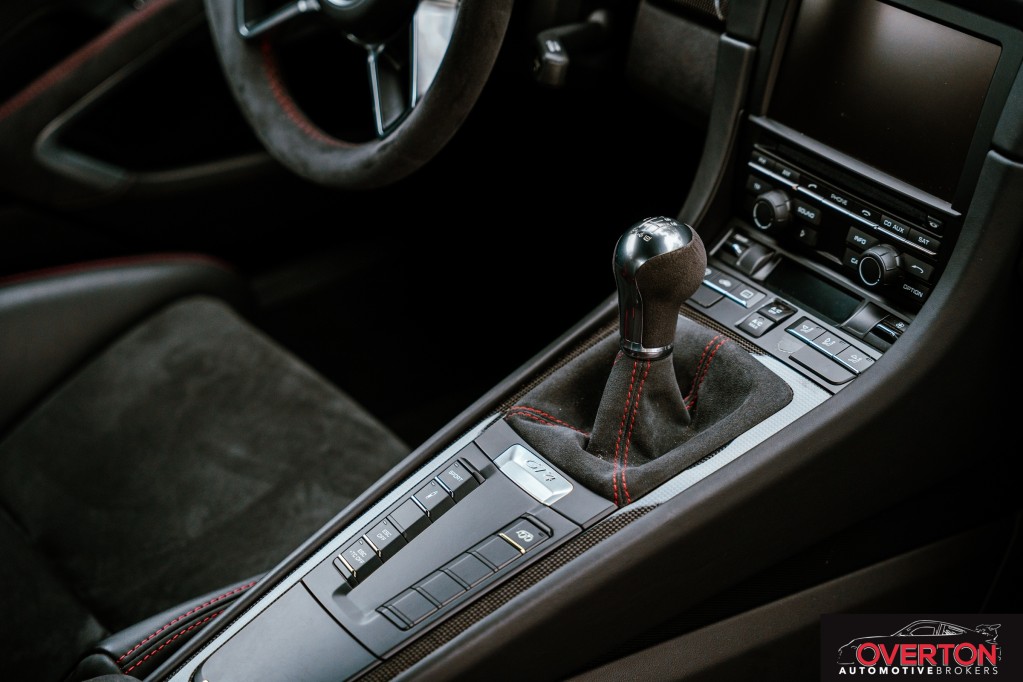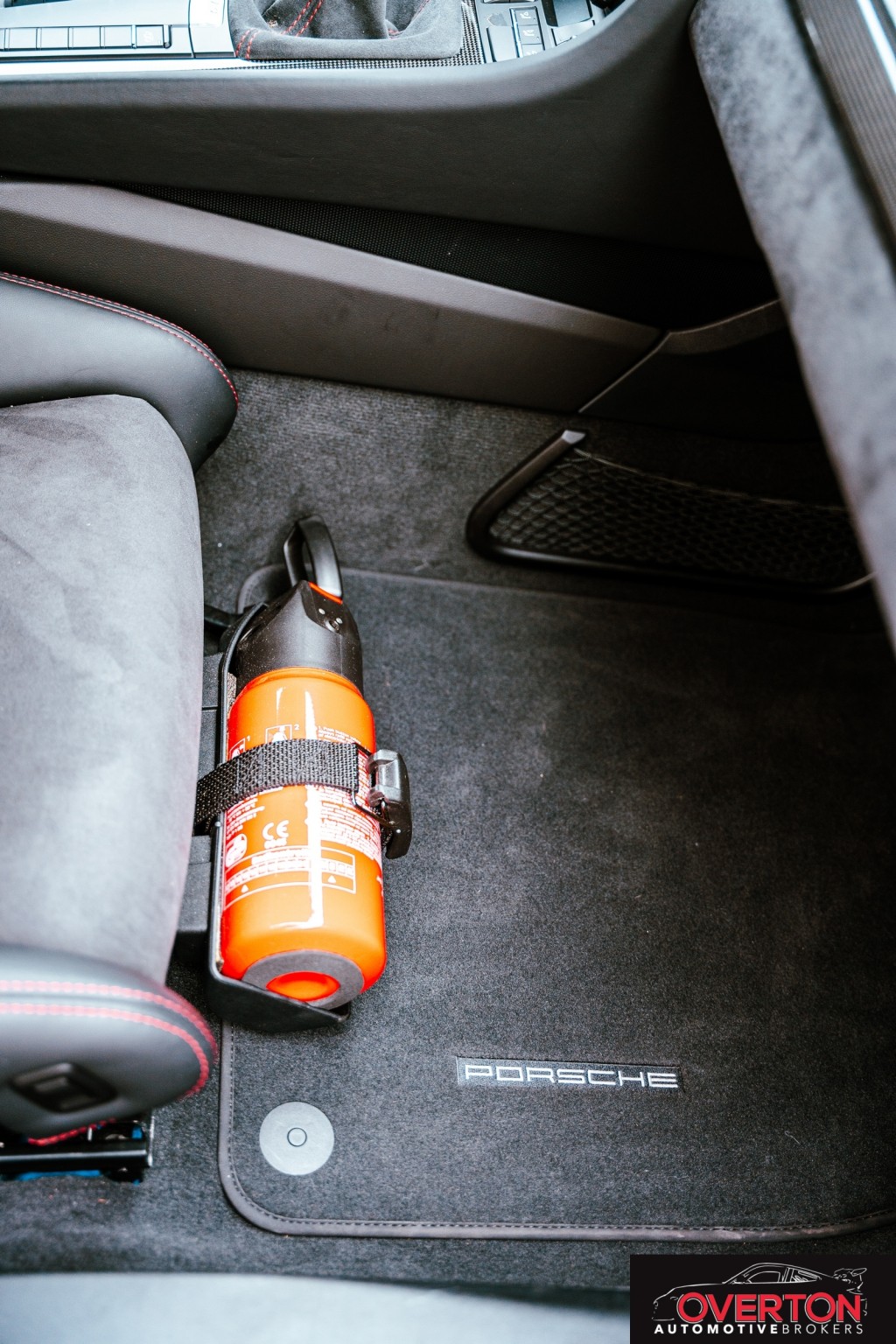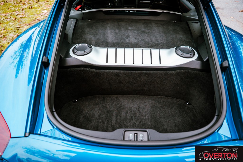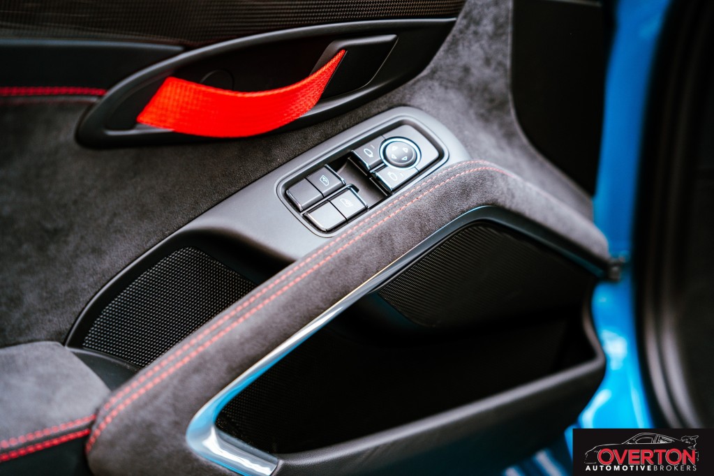 Options are Fire Extinguisher, Luggage Net in Passenger Footwell, Smoking Package, Bi-Xenon Headlights in Black including PDLS, Sport Chrono Package including Track Precision Application, Leather Interior in Black with stitching in Guards Red, Deviated Stitching in Guards Red with Leather Interior, Wings Supports in Black, Carbon Fiber Interior, Sapphire Blue Metallic exterior, Full Bucket Seats, Wheels Painted in Satin Black, Center Console Trim in Carbon Fiber, Seat Belts in Guards Red, Headlight Cleaning System Covers in Exterior Color.