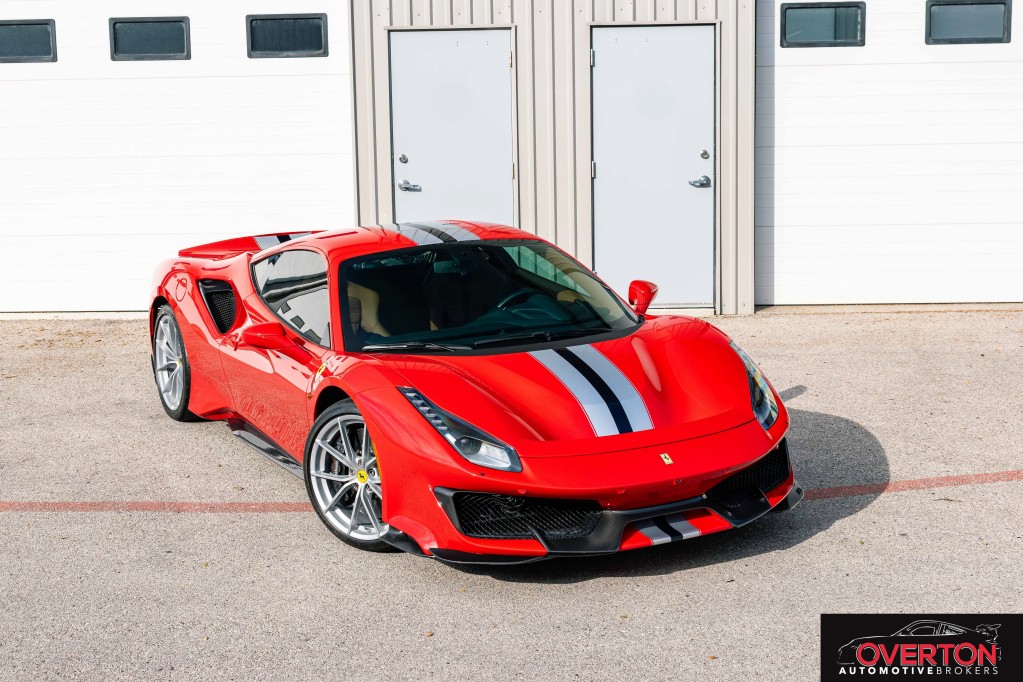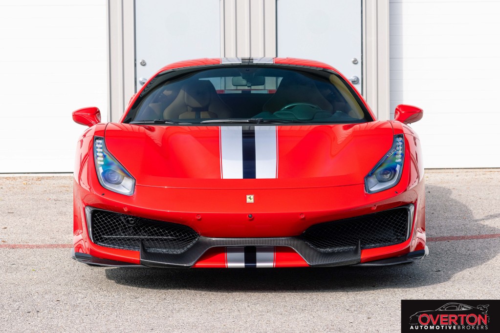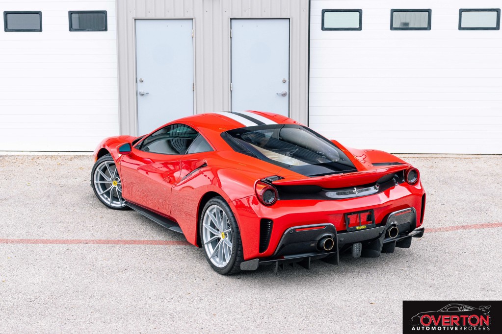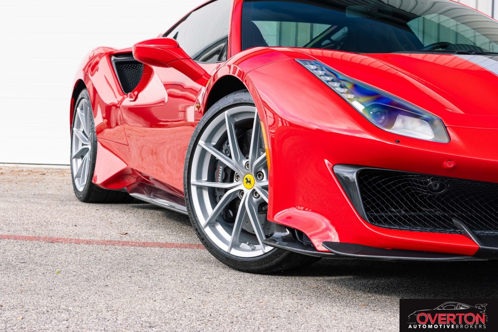 2019 Ferrari 488 Pista in Rosso Corsa and Tan Interior. Only 2300 miles. Twin Turbo 3.9L V8 with 710 HP revving to 8k RPM. 7-Speed F1 Dual Clutch Transmission.