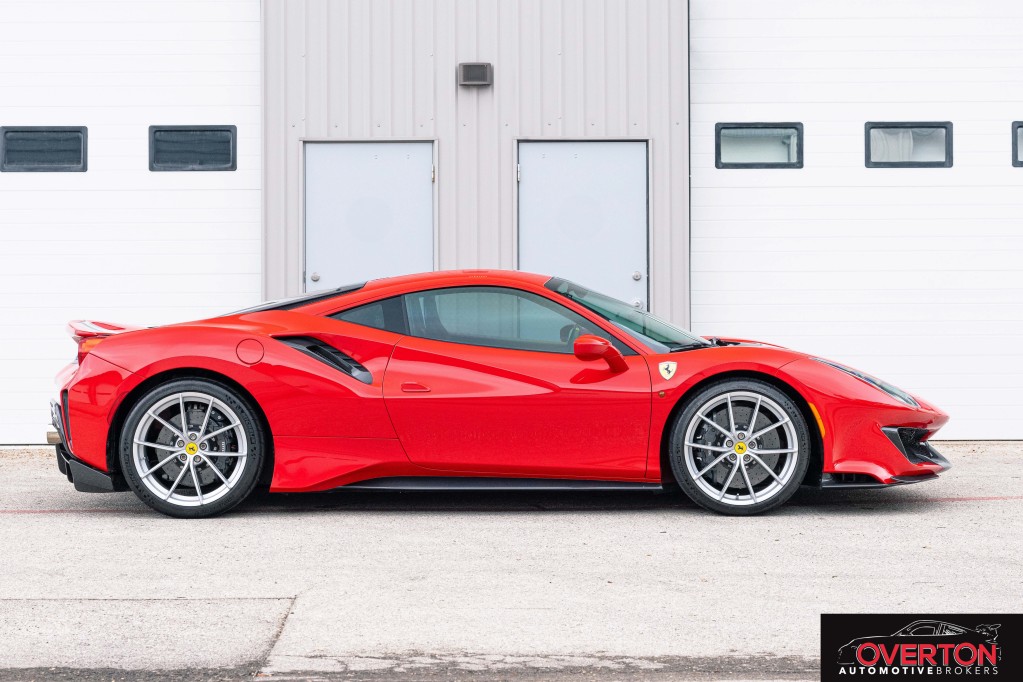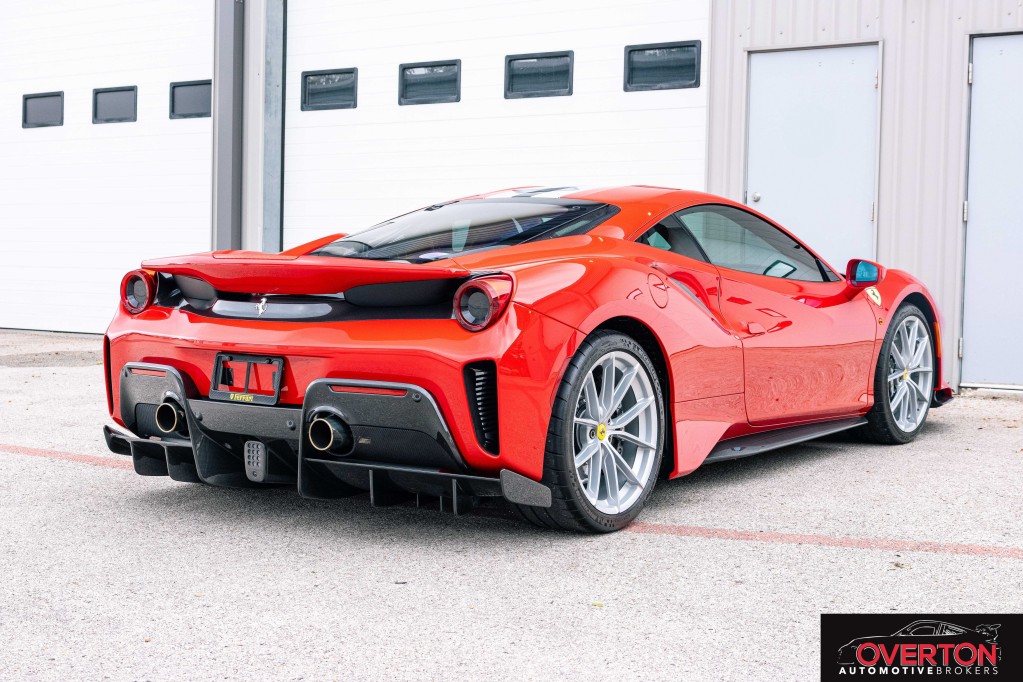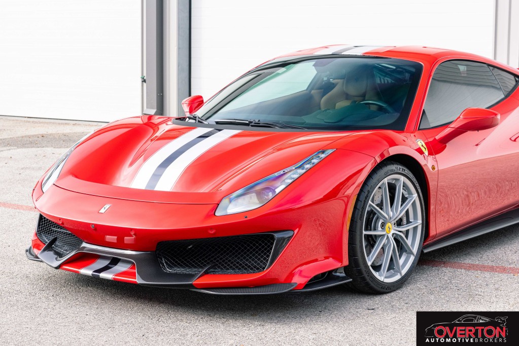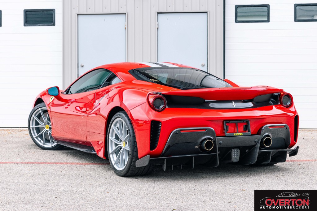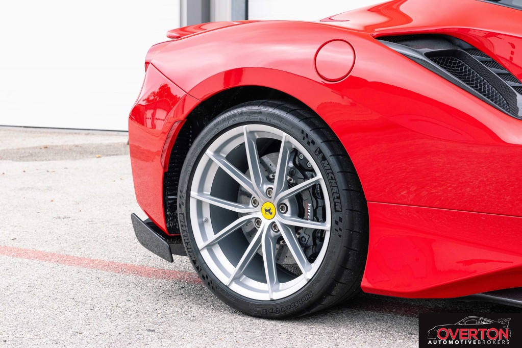 2019 Ferrari 488 Pista in Rosso Corsa and Tan Interior. Only 2300 miles. Twin Turbo 3.9L V8 with 710 HP revving to 8k RPM. 7-Speed F1 Dual Clutch Transmission.