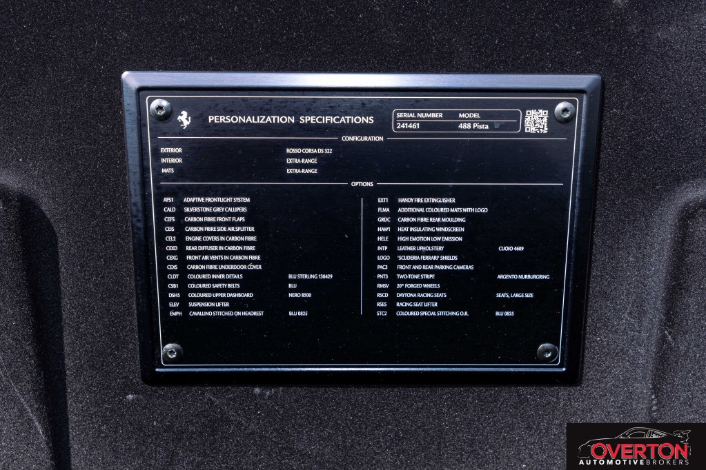 488 Pista - Personalization Options, Adaptive Frontlight System, Silverstone Grey Calipers, Carbon Fibre Front Flaps, Carbon Fibre Side Air Splitter, Engine Covers in Carbon Fibre, Rear Diffuser in Carbon Fibre, Front Air Vents in Carbon Fibre, Carbon Fibre Underdoor Cover, Coloured Inner Details (Blu Sterling 130429), Coloured Safety Belts (Blu), Coloured Upper Dashboard (Nero 8500), Suspension Lifter, Cavallino Stitched on Headrest (Blu 0825), Handy Fire Extinguisher, Additional Coloured Mats with Logo, Carbon Fibre Rear Moulding, Heat Insulating Windscreen, High Emotion Low Emission, Leather Upholstery (Cuoio 4609), 'Scuderia Ferrari' Shields, Front and Rear Parking Cameras, Two-Tone Stripe (Argento Nurburgring), 20'' Forged Wheels, Daytona Racing Seats (Large Size), Racing Seat Lifter, Coloured Special Stitching (Blu 0825)