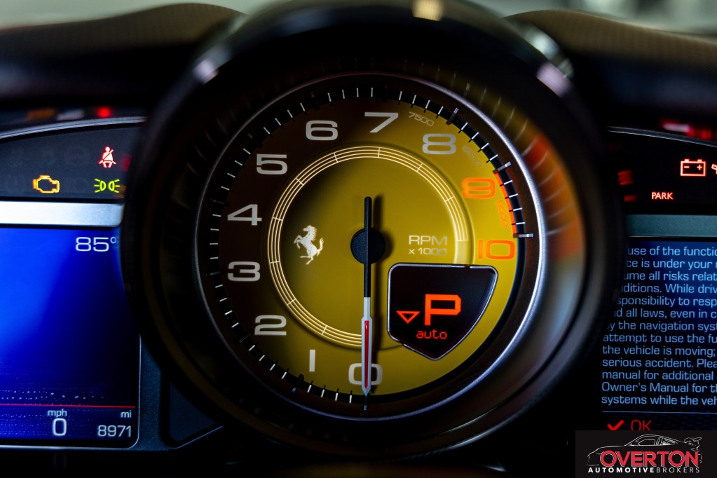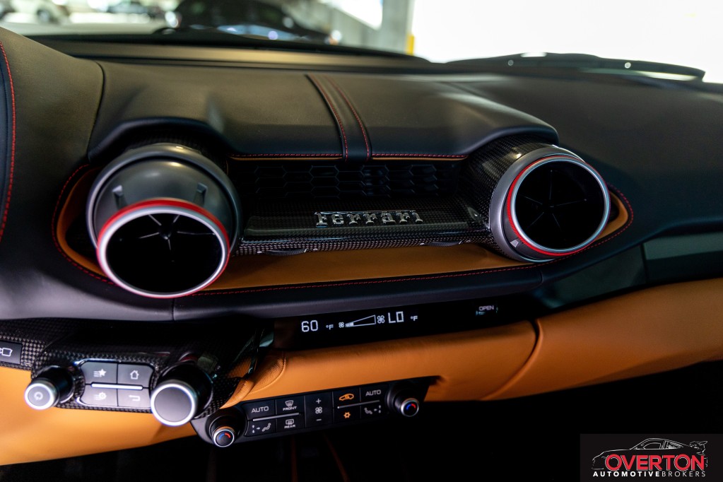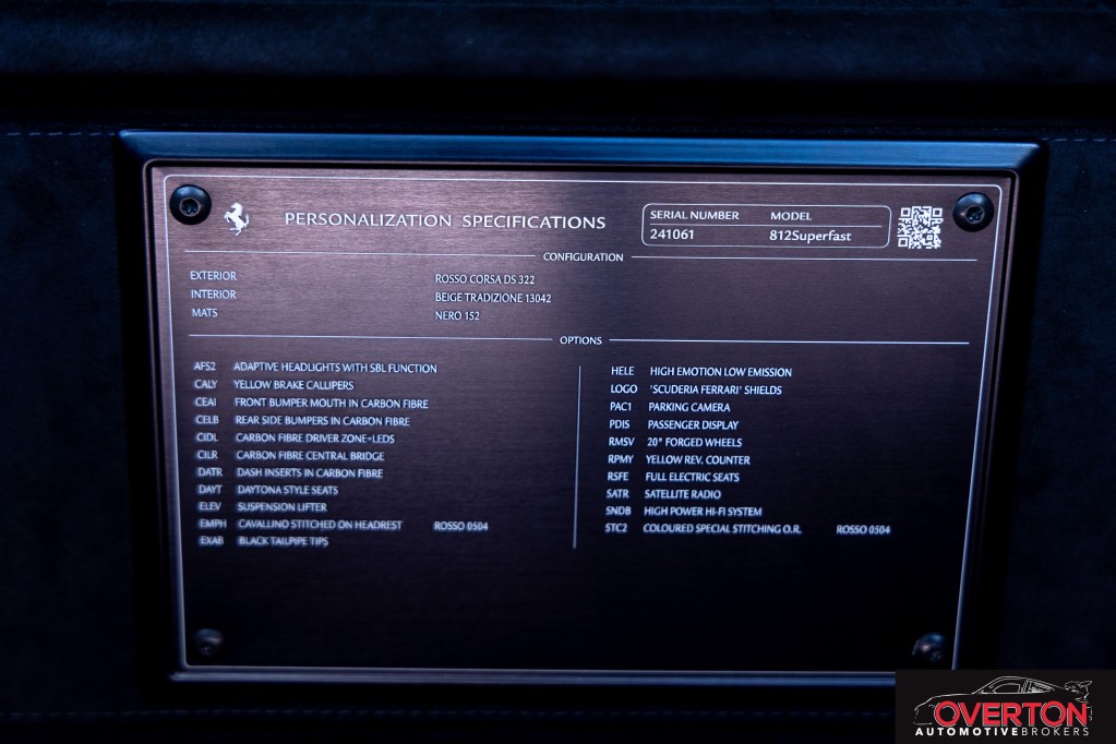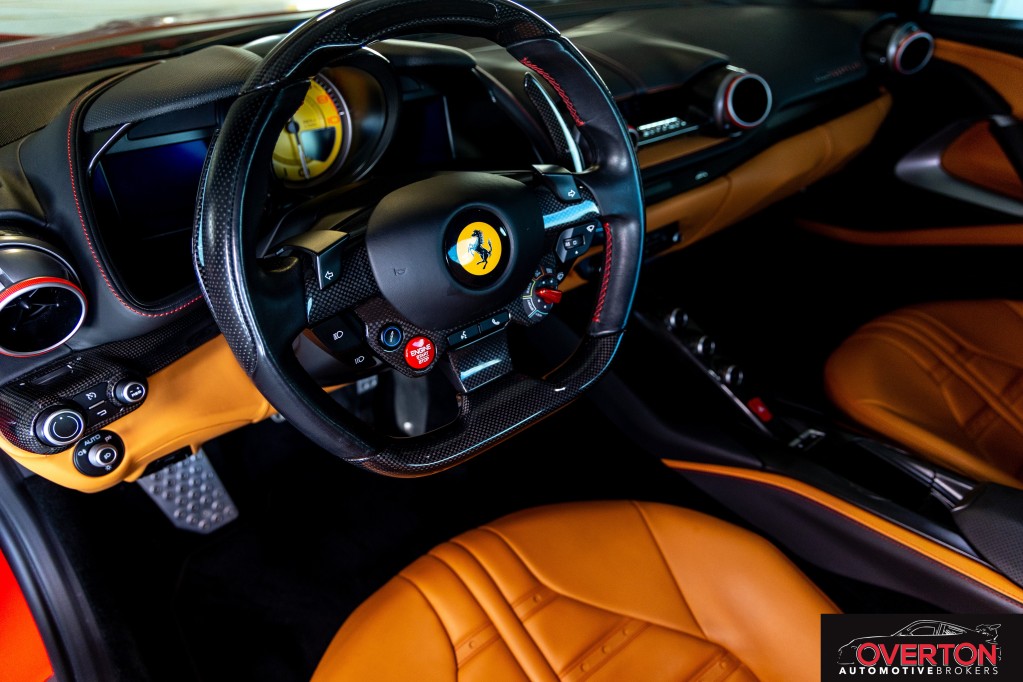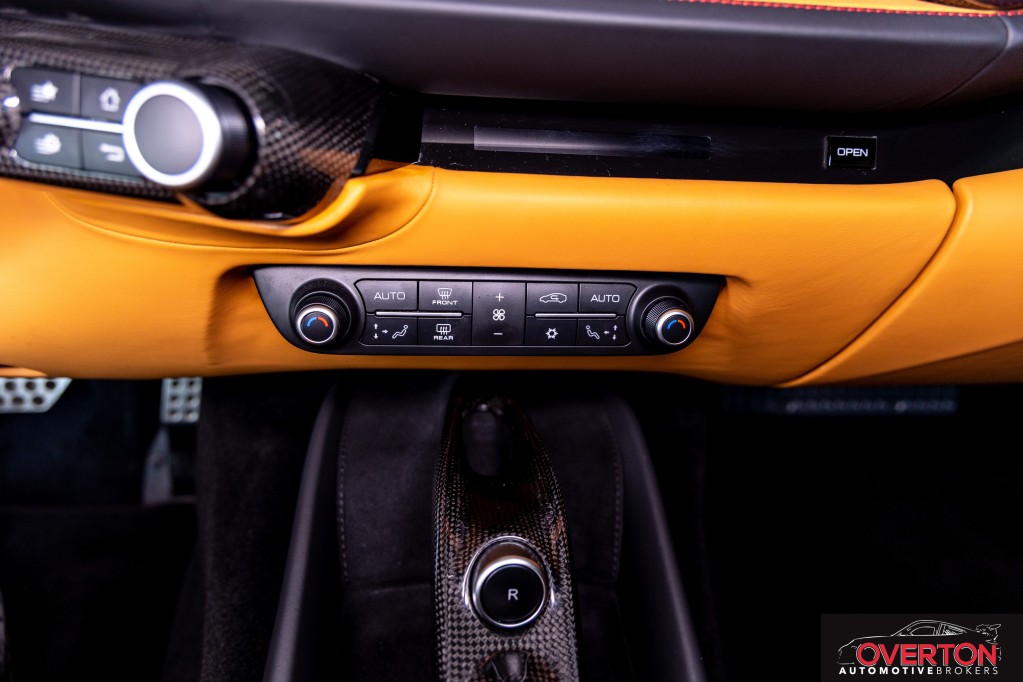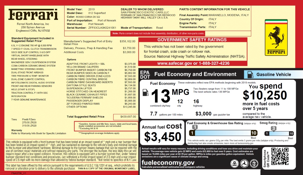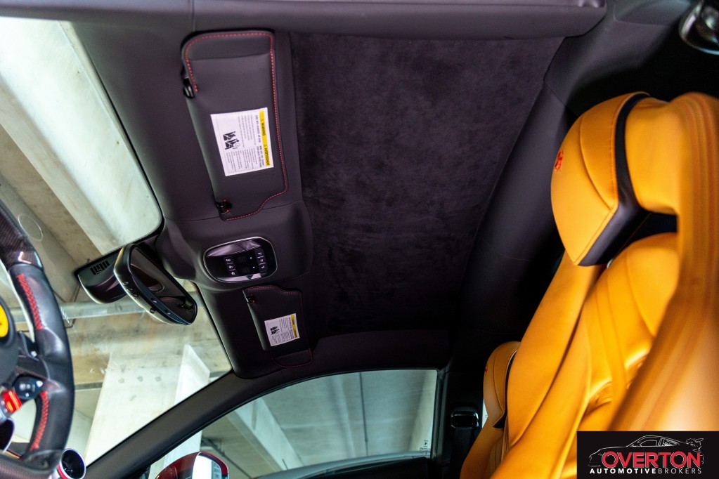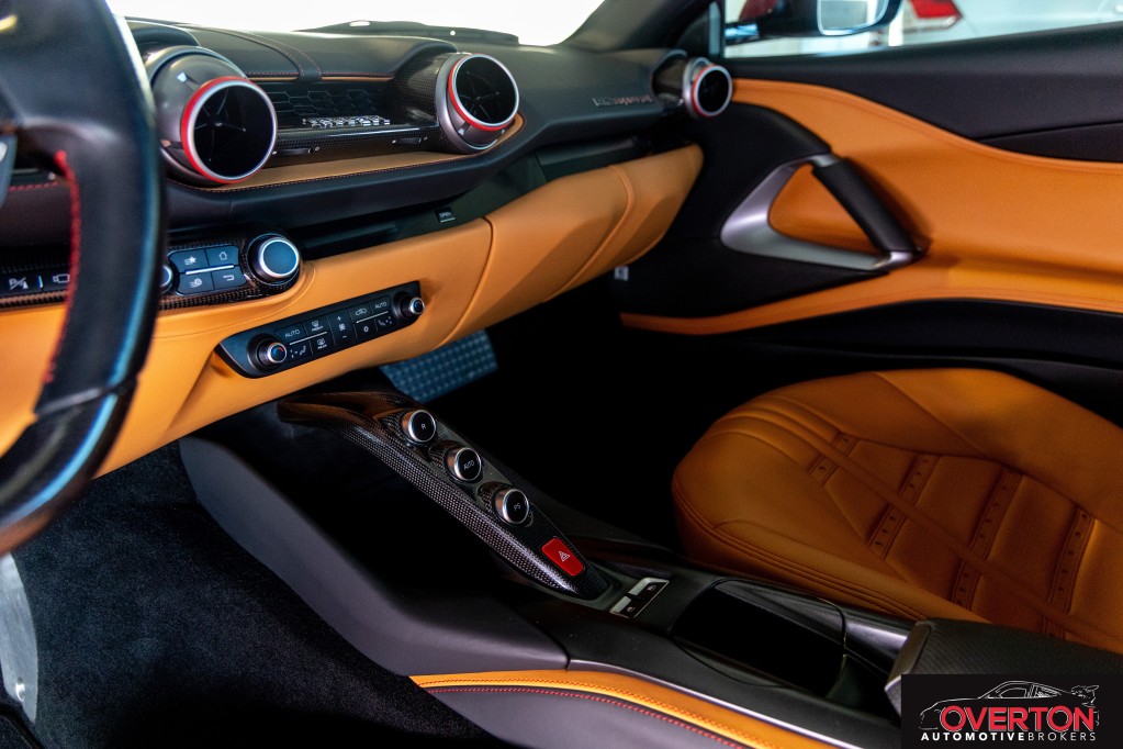 Options: Adaptive Front Lights with Static Bending Lights $3,375, Yellow Brake Calipers $1,519, Front Bumper Insert in Carbon Fiber $6,750, Rear Bumper Sides in Carbon Fiber $5,062, Carbon Fiber Driver Zone with LEDs $7,593, Carbon Fiber Central Bridge $2,869, Carbon Fiber Dashboard Inserts $7,593, Daytona Style Seats $4,134, Suspension Lifter $5,737, Horse Stitched on Headrest $1,266, Black Ceramic Exhaust Pipes $1,687, Scuderia Ferrari Shields $1,856, Passenger Display $5,906, 20-Inch Forged Painted Rims $6,243, Other Options $13,245 - High Emotion Low Emission, Parking Camera, Yellow Rev Counter, Full Electric Seats, Satellite Radio, High Power Hi-Fi- System Coloured Special Stitching O.R. Rosso and Cavallino Stitched on Headrest Rosso