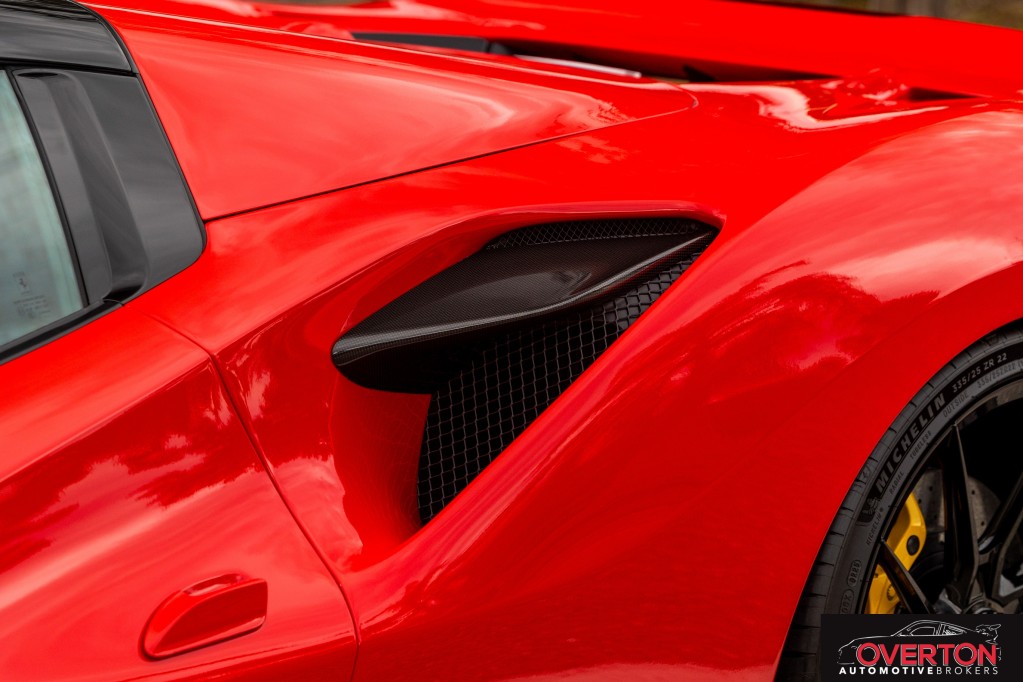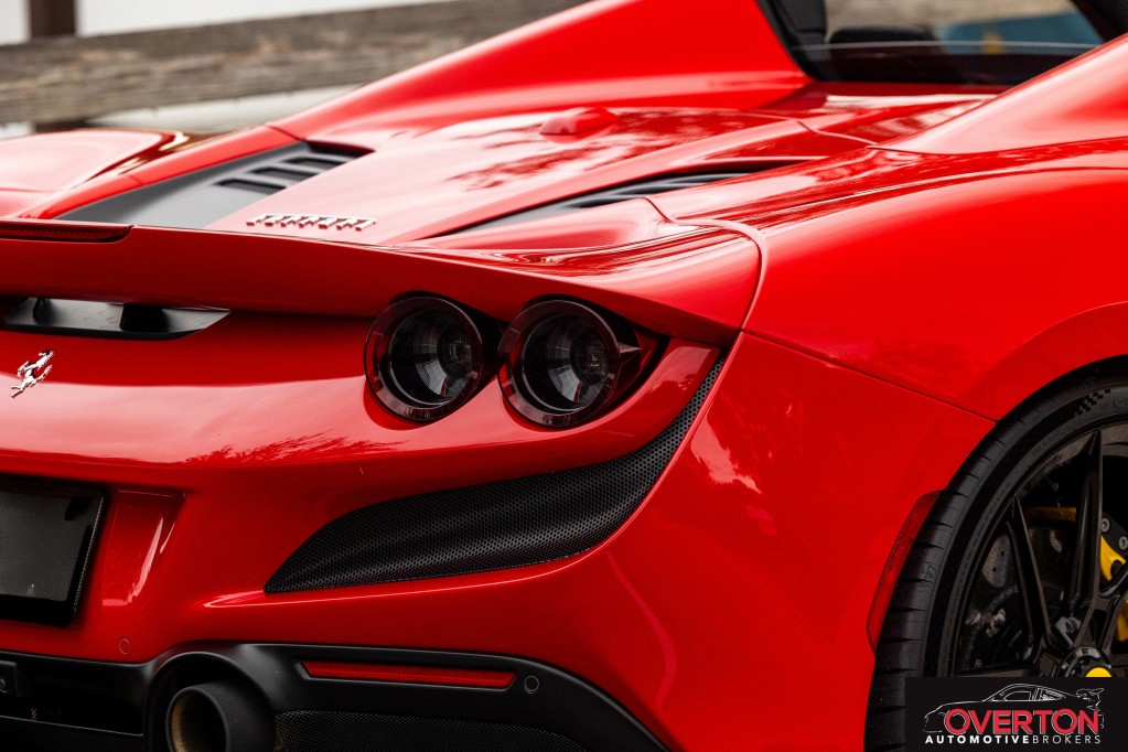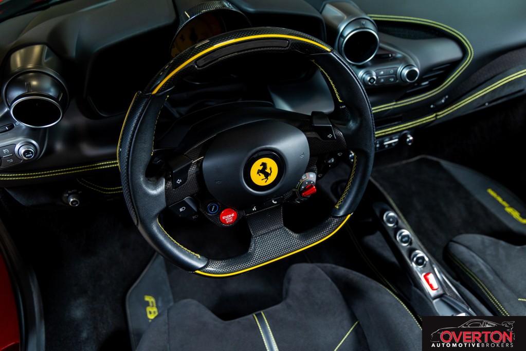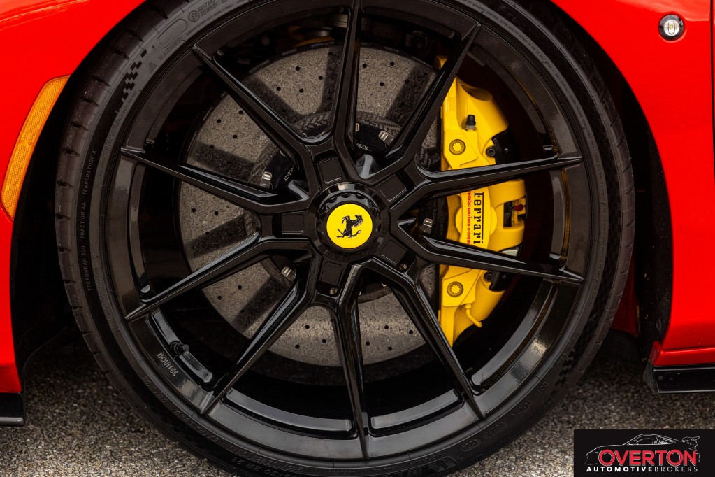 Twin Turbo, Mid-Mounted 3.9L V8 Engine, 710 Horsepower at 8,000 RPM, 7-Speed F1 Dual-Clutch Transmission, Side Slip Angle Control (SSC) 6.1 + E-Diff 3, FRS SCM-E Magnetorheological Dampers, FDE+ Ferrari Dynamic Enhancer, Carbon Ceramic Brake System, S-Duct Advanced Aerodynamics, Power Retractable Hard Top, Manettino Steering Wheel, Mounted F1 System Mode Controller, Multimedia System with Bluetooth & DAB, Sirius XM Satellite Radio Subscription, Full LED Headlights & Turn Signals, Tire Pressure & Temperature Monitor, Driver, Passenger, & Side Airbags, Dual-Zone Climate Control, Rear Parking Sensors, HELE - High Emotion Low Emissions, 7-Year Genuine Maintenance - Options - AFS System (Adaptive Front light System), Central Part of Seats in Alcantara (Alcantara Nero 9440), Alcantara Door Panels (Alcantara Nero 9440), Alcantara Exterior Door Panel Medallion in Alcantara (Alcantara Nero 9440), Alcantara Full Seats (Alcantara Nero 9440), Two-Tone Bodywork (Nero DS 1250), Back Radar, Yellow Brake Calipers, Carbon Fibre Side Air Splitter, Carbon Fibre Driver Zone + LEDs, Carbon Fibre Central Bridge, Coloured Inner Details (Nero 8500), Matte Black Front Lid Collar, Coloured Safety Belts (Yellow), Alcantara Centre Console (Alcantara Nero 9440), Single-Colour Dreamline on F1 Paddles (Giallo Modena DS 4305), Dreamline on Upper + Lower Steering Wheel Rim (Giallo Modena DS 4305), Alcantara Lower Dashboard (Alcantara Nero 9440), Suspension Lifter, Cavallino Stitched on Headrest (Thread in Giallo 0113), Sport Tailpipe Tips, Advanced Front Driving Camera, Additional Coloured Mats with Logo, ''Scuderia Ferrari'' Shields, Electrochromic Rear-View Mirror, Parking Camera, Yellow Rev Counte